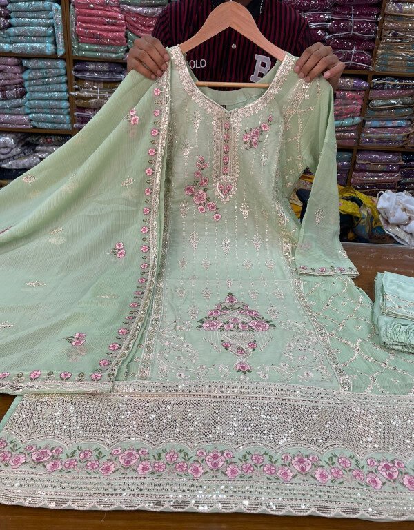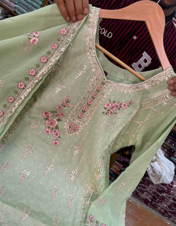 বডি :- পাকিস্তানি লাক্সারি শিপন জর্জেট, সিকুয়েন্স এবং এমব্রয়ডারি ওয়ার্ক, লং ৪৫ ইঞ্চি।
